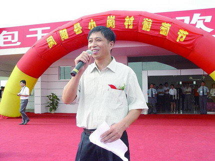 这是2005年8月7日,沈浩在凤阳县小岗村第二届葡萄节上讲话。 新华社发(吴晓泉摄)