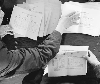 3月15日,安徽蚌埠市固镇县仲兴乡首次通过“公推直选”进行了乡党委班子的换届选举。这是监票人在统计选票。新华社记者 郭 晨摄