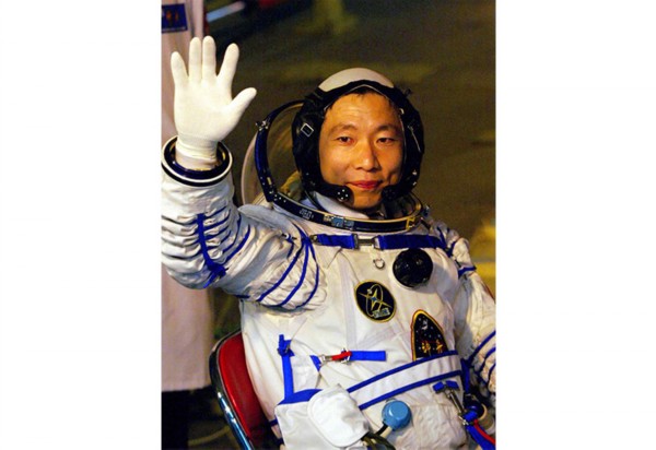 2003年10月15日,执行中国首次载人航天飞行任务的航天员杨利伟出发登舱前挥手致意。