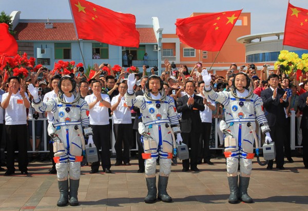 2012年6月16日,神舟九号航天员出征仪式在酒泉卫星发射中心航天员公寓问天阁举行,航天员景海鹏、刘旺、刘洋(从右至左)向欢送人群挥手致意。