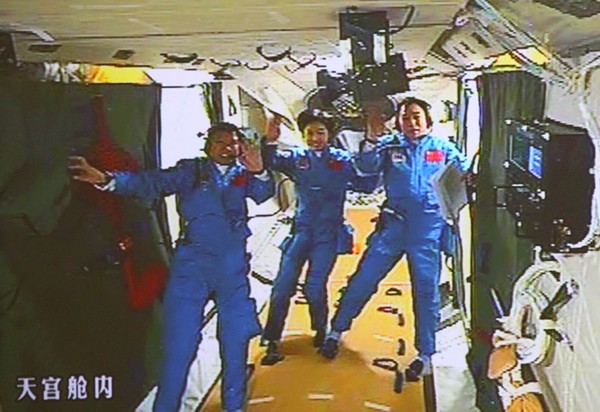 2013年5月22日,航天员王亚平(中)、聂海胜(右)、张晓光在模拟天宫一号组合体内进行太空授课训练。