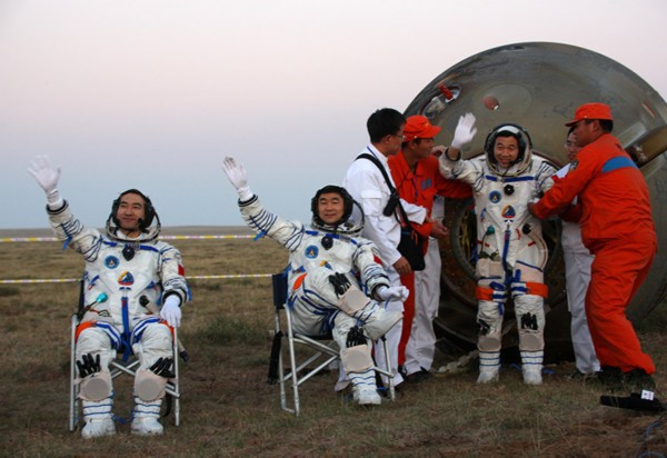 2008年9月28日,神舟七号返回地球,航天员翟志刚、刘伯明、景海鹏(从左至右)自主出舱后向现场搜救人员挥手致意。