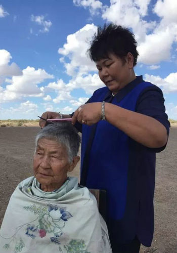 乌云苏依拉义务帮助年老牧民理发