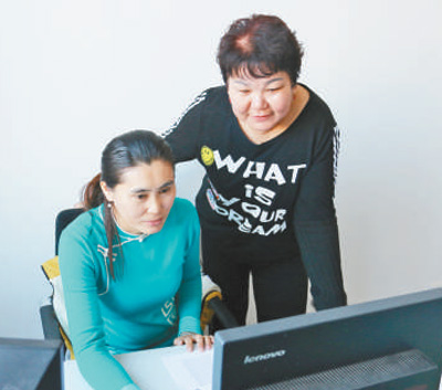 乌云苏依拉(右)正在与村民交流农家乐经营经验。资料照片
