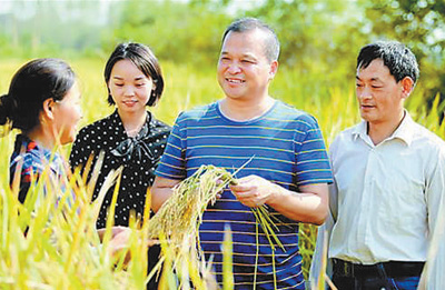 郑雄(右二)和村民在查看庄稼长势。资料照片