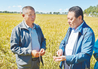 在兴安盟五道河农牧专业合作社,隋维钧(右)在查看水稻成熟情况。