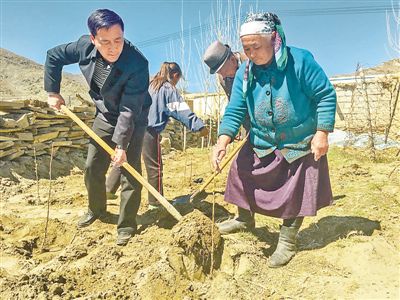 王红星(左)与结亲户共植民族团结树。青河县委宣传部提供