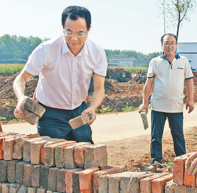 邓真晓(左)在临泉县艾亭镇枣树庄村与村民一起进行环境整治工作。