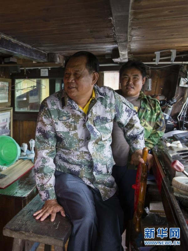 11月14日,在海南省琼海市潭门镇,王书茂(左)在渔船上。 新华社发(宋国强 摄)