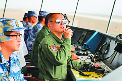 戴明盟在塔台上指挥飞行训练(2015年9月22日摄)。 新华社发