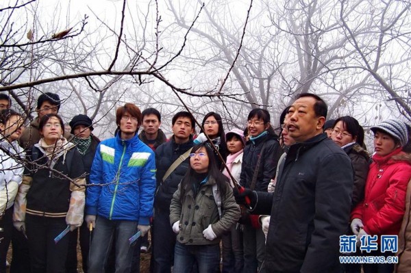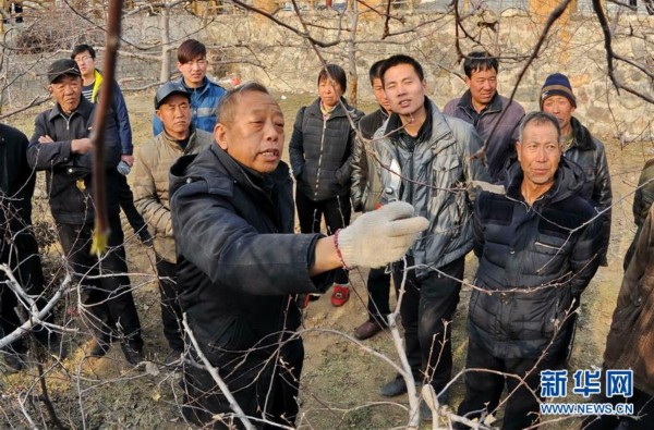 李保国(前左)在河北省内丘县岗底村向村民讲解果树修剪知识(2016年1月27日摄)。新华社记者朱旭东摄