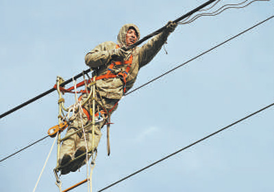 许启金穿着屏蔽服在220千伏输电线路上带电消缺。张 勇摄(影像中国)