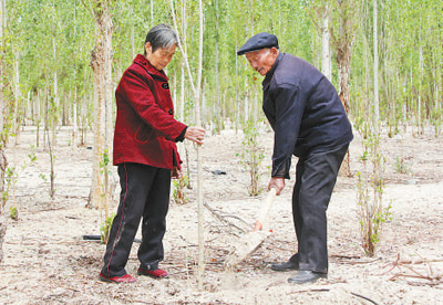 付志周(右)和老伴陈爱兰在种树。记者 韩立群摄