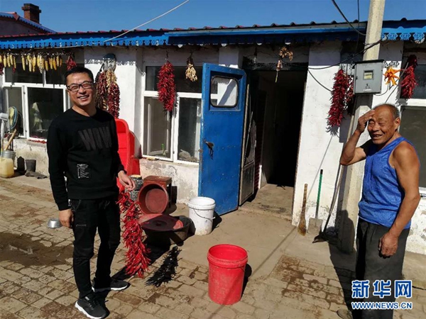 于文涛(左)走访贫困户(资料照片)。新华社发