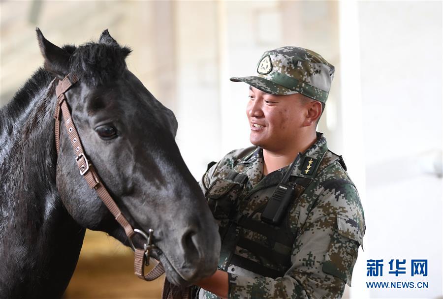 西部战区陆军某旅玉树独立骑兵连连长尼都塔生与“无言的战友”亲切交谈(7月6日摄)。