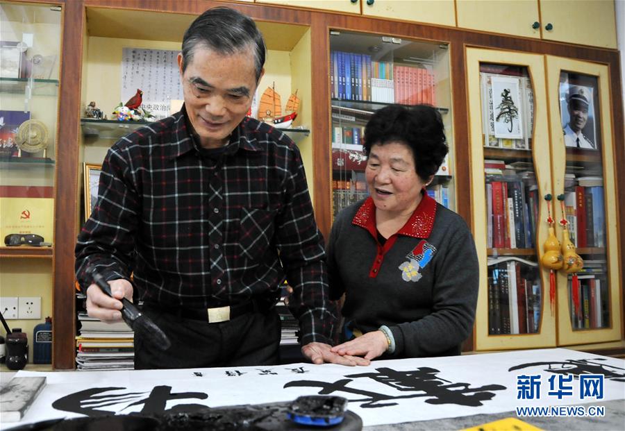 麦贤得(左)在练习书写毛笔字(2016年12月27日摄)。新华社记者 周科 摄