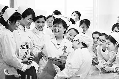 杜丽群(中)与艾滋病科护士交流。资料图片