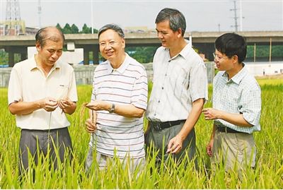 卢永根(左二)带领团队在田间观察水稻生长情况。资料照片